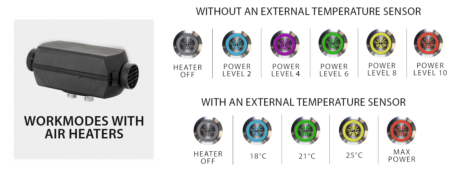 - Maximum heating power of 2 kW for 12V model