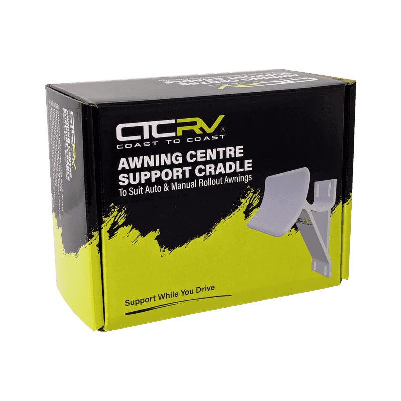 The COAST RV White Aluminium Cradle to suit Auto and Manual Roll Out Awnings is a centre support cradle designed to stabilise roll out awnings during travel and support the roller when parked. It is suitable for both manual and electric roll out awnings, including Carefree models. The cradle head pivots to engage or release the roller as the awning extends or retracts. It is constructed from durable aluminium with a white finish.