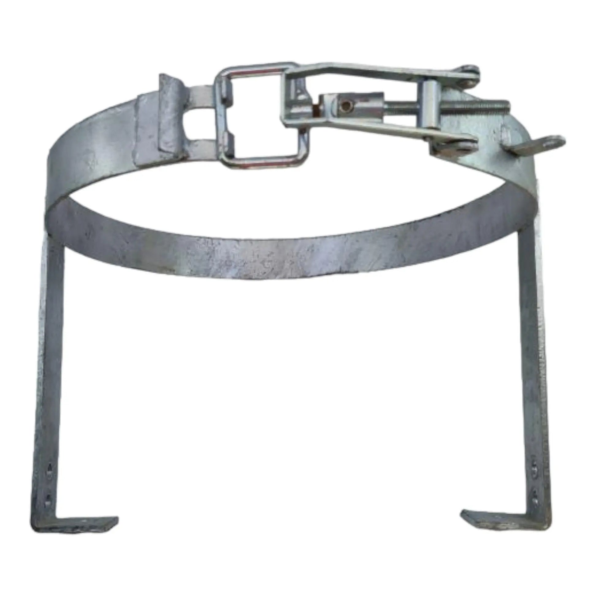 Galvanised gas cylinder cradle with a quick release mechanism.