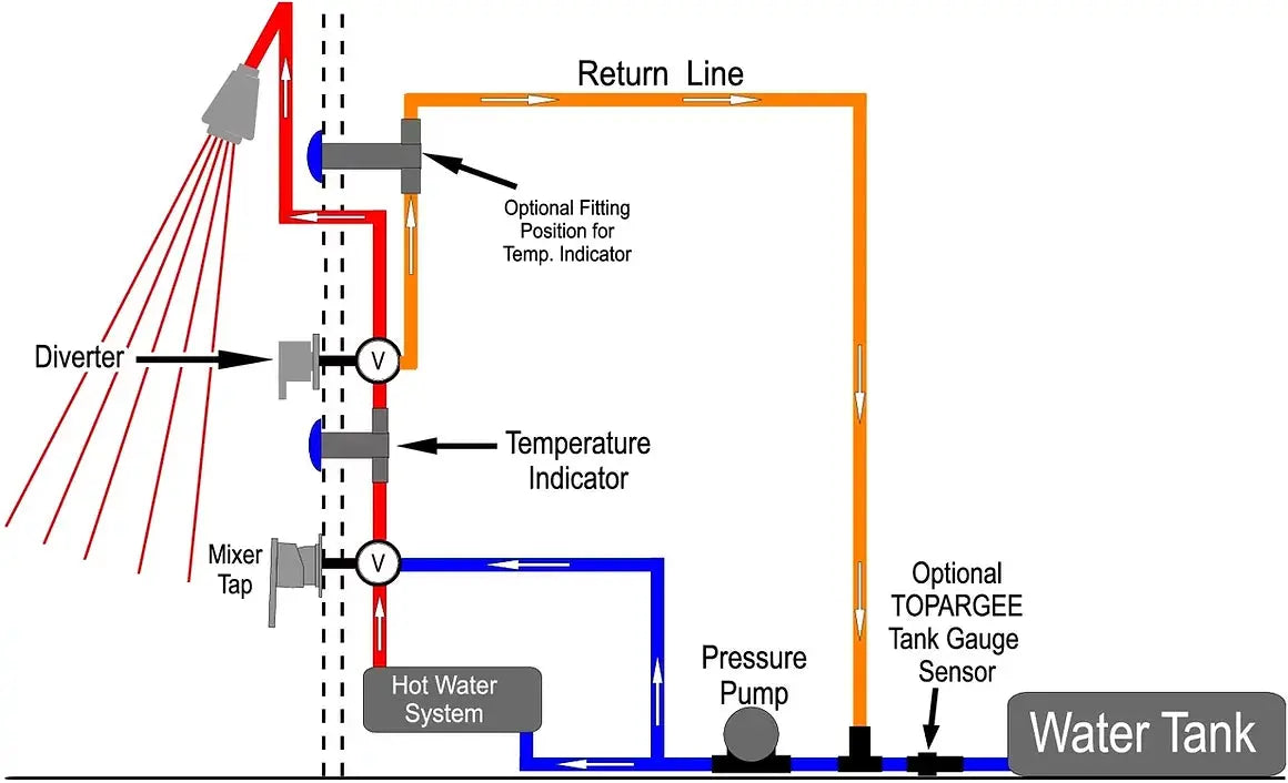 - Redirects fresh clean water back into your tank instead of down the drain whilst heating