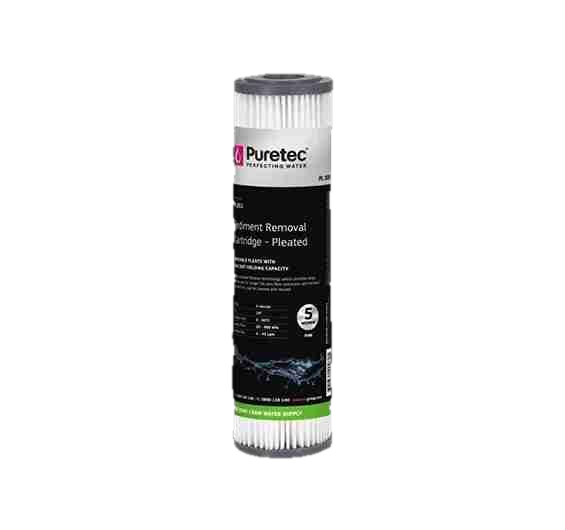 The PL051 Cartridge features a large surface area for sediment removal. It is a pleated sediment cartridge that is both washable and durable, making it ideal for various filtration uses. The 5 micron, 2.5" x 10" cartridge is manufactured from non-woven, reusable polyester fabric.