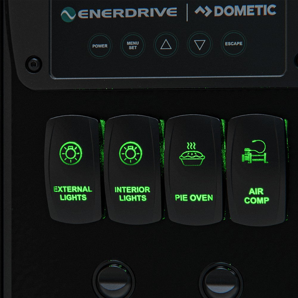 - Front panel: 4 × customisable rocker switches; 1 × 12 V DC cigarette socket; 1 × dual USB‑A/USB‑C (up to 100 W); 1 × Anderson plug; 1 × twin RCD‑protected 240 V powerpoint; optional inclinometer