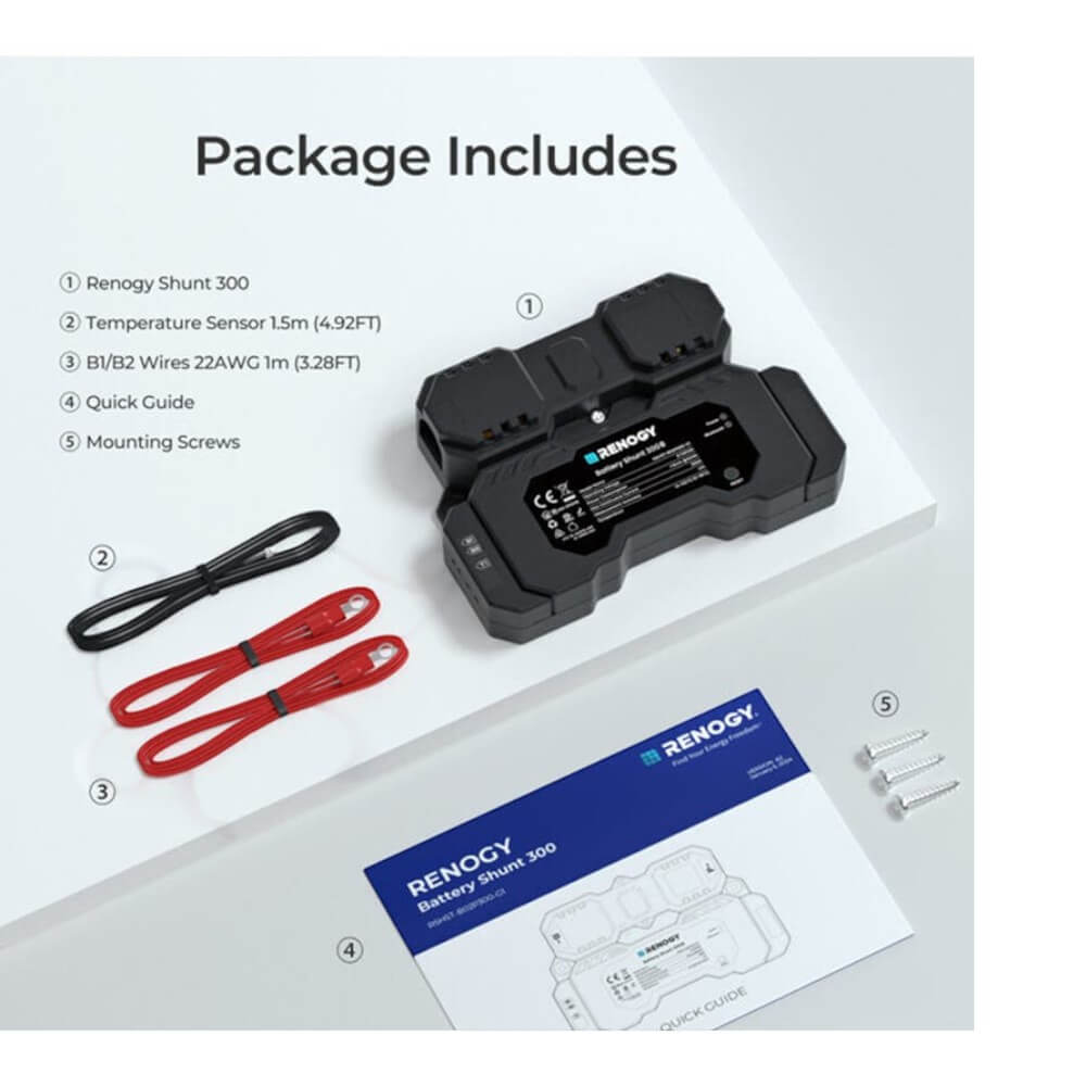 - Includes: Battery Shunt 300 (1x); Quick Guide (1x); Mounting Screws (3x); B+ Wires 1 m 22 AWG (2x); Temperature Sensor 1.5 m (1x)