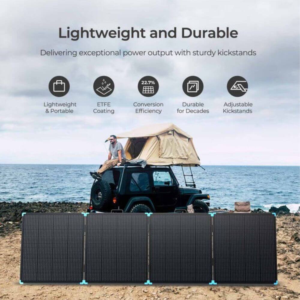 The RENOGY PRO 400W Lightweight Portable Solar Panel Kit (RSP400LSC-G1-AU) is a 400 W foldable solar panel kit with MC4 connectors, IP67 ingress protection, and an ETFE-coated surface.